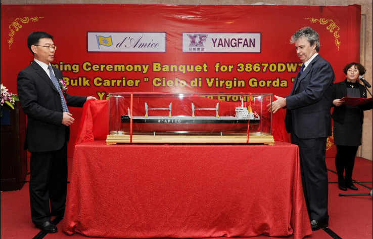 圖為:d‘Amico 集團(tuán)首席執(zhí)行官Cesare d'Amico 和揚(yáng)帆集團(tuán)董事長、總裁李明東在命名午宴上為船模揭幕。